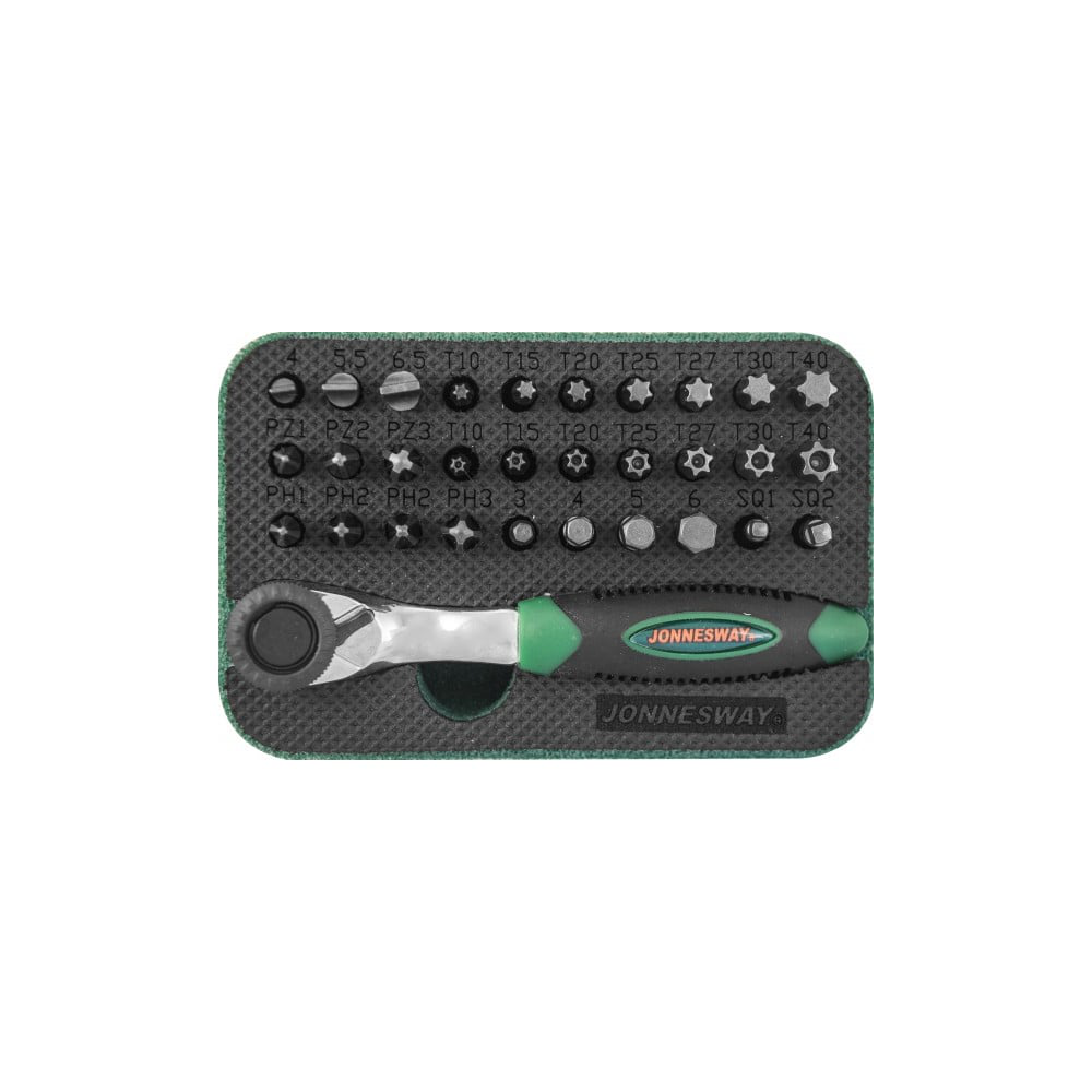 Набор вставок-бит с трещоточной рукояткой мини 1/4"DR, 60 зубцов, 32 предмета Jonnesway RD01032S 49303 включает в себя большое количество разнообразных бит, которые подходят для крепежа в автомобилях, отдельных узлах и конструкциях.. Компактное расположение бит обеспечивает небольшие размеры кейса и простоту переноски