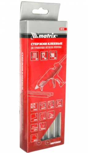 Стержни клеевые MATRIX 930730 используются совместно с клеевыми пистолетами, являются универсальными и применяются для склеивания изделий из дерева, металла, пластика, ткани, кожи, стекла, керамики, бумаги, картона, резины.