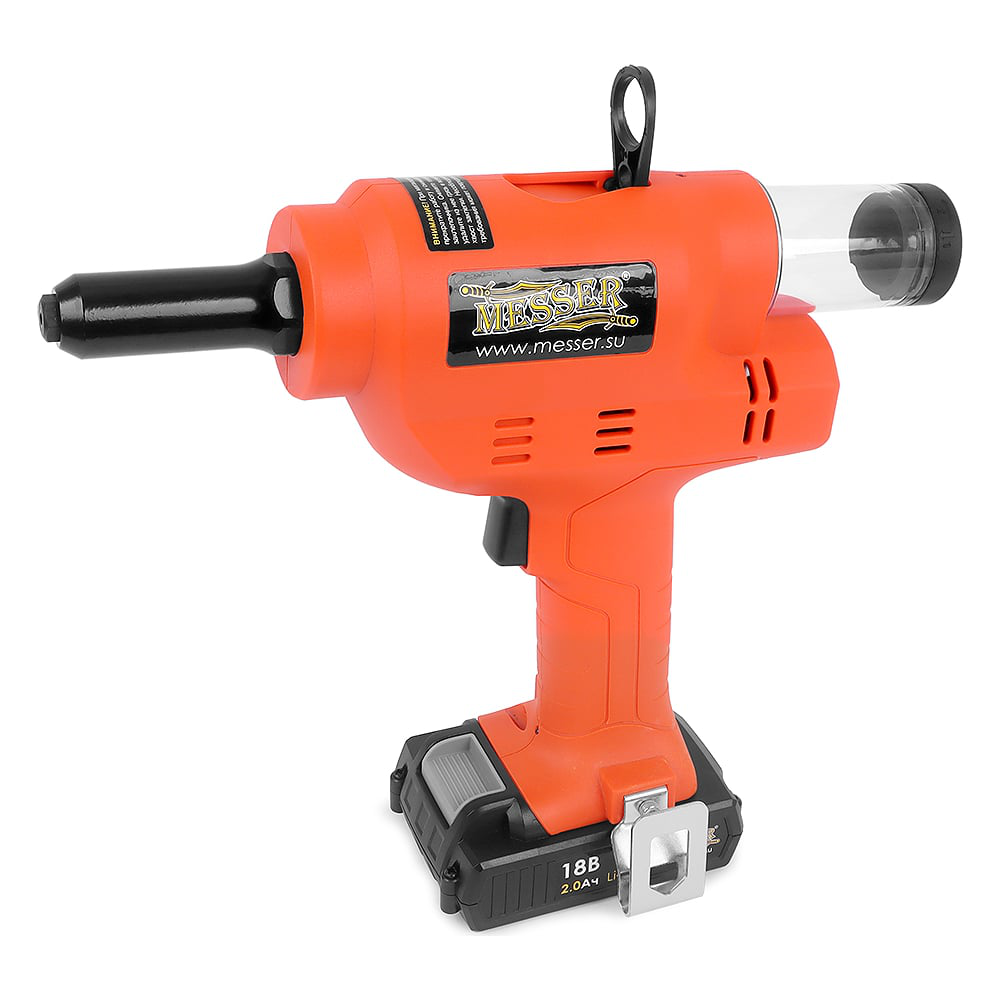 Вытяжной заклепочник MESSER M4000 05-32-401 позволяет устанавливать вытяжные заклепки размерами от 2,4 мм до 5,0 мм, включая заклепки из нержавеющей стали. Главной особенностью является его универсальность. Он может работать как от сети 220В, так и от аккумулятора входящего в комплект. Большой ход штока (25мм) позволяет устанавливать все длины заклепок за один цикл. Модель оснащена системой быстрой смены рабочих губок, что значительно ускоряет необходимое обслуживание инструмента. Имеет электронную защиту от перегрузок. В случае нештатной ситуации, например, при заклинивании хвоста заклепки внутри инструмента, заклепочник остановит работу и сообщит об ошибке, включив красный светодиодный индикатор на корпусе. Помимо стандартного контейнера для сбора хвостовиков заклепок в комплекте с MESSER M4000 поставляется дополнительный контейнер увеличенного объема. На верхней части корпуса расположено широкое и надежное складное кольцо для крепления инструмента на подвесе или карабине. В нижней части рукояти, у самого аккумулятора располагается съемная скоба, позволяющая закрепить инструмент на ремне. Насадки для установки различных диаметров заклепок, поставляемые в комплекте с инструментом, хранятся в удобном пластиковом контейнере. Ключ для смены насадок также идет в комплекте.
