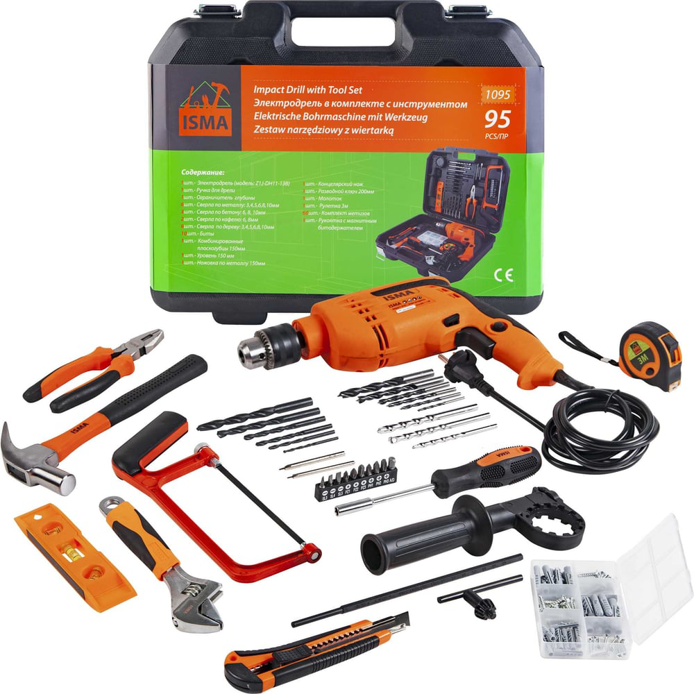 Многофункциональный комплект ISMA сочетает в себе мощную дрель и полный набор ручных инструментов, что делает его идеальным решением для дома, дачи и полупрофессиональных задач. Удобная комплектация позволяет выполнять широкий спектр работ: сверление, сборку мебели, монтаж полок, ремонт и многое другое.Характеристики комплектаЭлектродрель:Мощность: 750 ВтМаксимальные обороты: до 3000 об/минТип патрона: Быстрозажимной ключевойОграничитель глубины: 240 ммСверла:По дереву: 3, 4, 5, 6, 8, 10 ммПо металлу: 3, 4, 5, 6, 8, 10 ммПо бетону: 6, 8, 10 ммПо кафелю: 6, 8 ммДополнительные инструменты:Биты (10 штук) + магнитный держательПлоскогубцы (150 мм)Ножовка по металлу (150 мм)Разводной ключ (200 мм)Канцелярский ножМолотокРулетка (3 м)Крепежи (60 элементов)Пластиковый кейс для храненияУниверсальный набор: “Всё в одном” для различных задач.Мощная и надежная электродрель: 750 Вт с высокой скоростью вращения.Быстрозажимной патрон: Обеспечивает надежную фиксацию насадок и быструю смену сверл.Оснастка для работы с разными материалами: Идеально подходит для дерева, металла, бетона и кафеля.Удобный и прочный кейс: Обеспечивает защиту и легкую транспортировку.Многофункциональный комплект ISMA — это надежный помощник для домашних и полупрофессиональных работ, предоставляющий все необходимое для выполнения разнообразных задач.