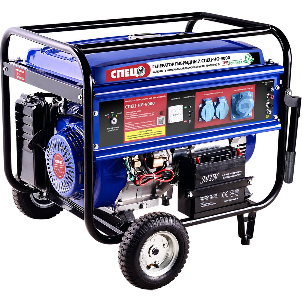Гибридный генератор газ-бензин СПЕЦ HG-9000и комплект для подключения к сети+баллону предназначается для снабжения бытовых приборов качественным электричеством. Предусматривается розетка на 32 А для подключения высокомощного строительного оборудования. В качестве топлива используется не только бензин АИ-92 и сжиженный газ в баллонах (пропан-бутан), но и магистральный газ (метан). Все элементы генератора крепятся на жесткую металлический раму, которая имеет ручки и колеса для удобство перемещения по рабочей площадке. Наличие клемм 12 В дает возможность подзарядки аккумуляторной батареи. Максимальное потребление природного газа 3,75 м3/ч. Генератор транспортируется без масла, и перед запуском генератора необходимо залить масло в картер.