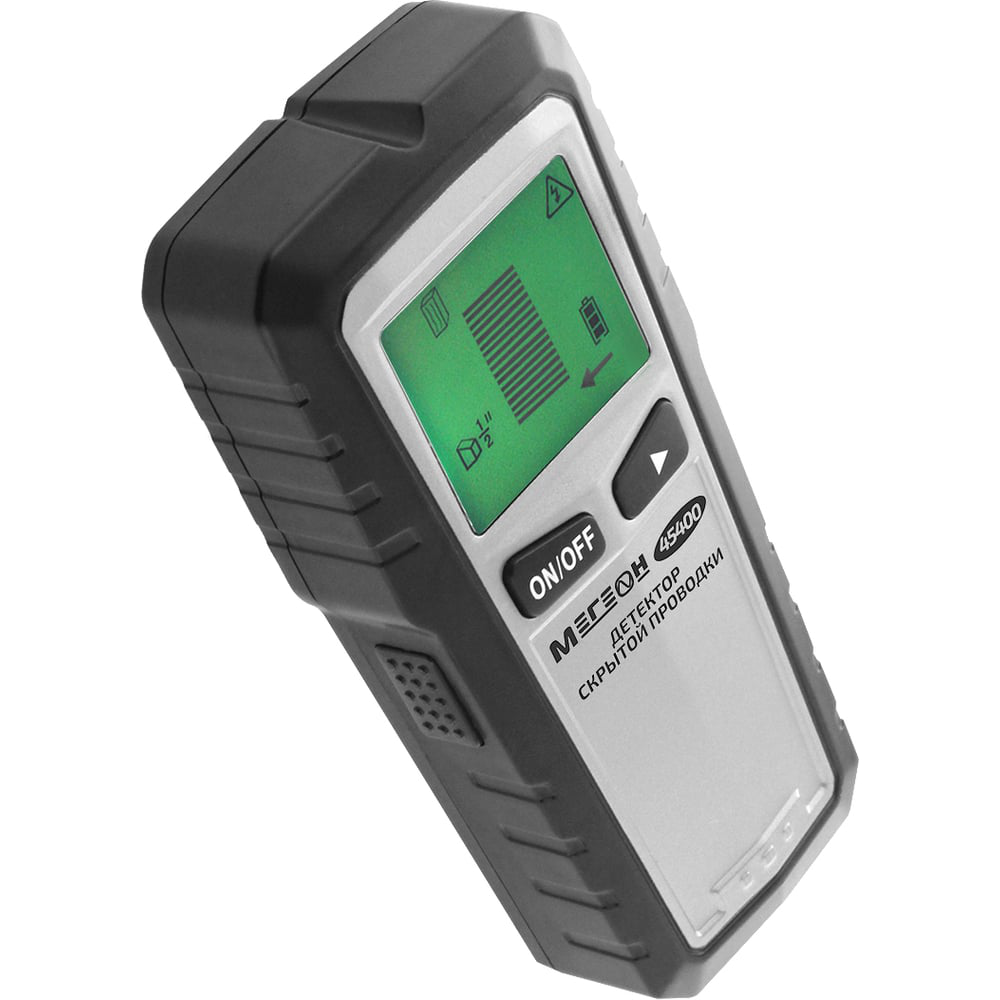 МЕГЕОН 45400 - многофункциональный электронный детектор скрытой проводки с цифровым ЖК-дисплеем и звуковым предупреждением. Прибор станет незаменимым помощником специалистов- электриков, плотников и строительных бригад, занимающихся различными видами косметического ремонта в жилых и промышленных помещениях. Детектор с высокой точность определит положение деревянных элементов за гипсокартонными стенками, электропроводки, арматуры, труб водо и газоснабжения, гвоздей, шурупов. Облегчит процесс монтажа настенного оборудования, поможет сэкономить много времени и усилий при поиске несущих конструкций. Система сканирования обеспечивает в общей сложности пять режимов. "Умная" калибровка, ЖК-дисплей с подсветкой, эргономичный дизайн и технология multi-sense делают его идеальным как для профессионалов, так и любителей. С помощью этого устройства можно сразу найти подходящее место на стене без лишних отверстий.