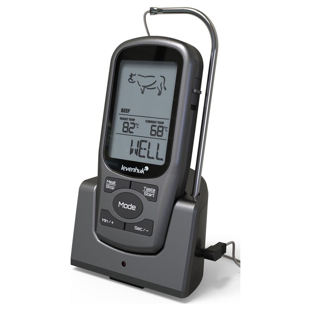 Беспроводной термощуп для мяса Levenhuk F30 78931 позволяет точно определять температуру мяса, но также имеет несколько режимов работы – можно выбрать степень прожарки и тип мяса. Также есть функции таймера и фиксации текущей температуры. Благодаря этому даже неопытный повар, следуя рецепту, сможет получить максимально вкусный стейк. Его можно использовать как обычный комнатный термометр: он достоверно измеряет температуру воздуха. Подойдет для определения температуры воды, например для купания. А если поместить его в садовую клумбу, можно будет узнать, подходит ли температура почвы для посадок. Еще один способ использовать термощуп – взять его с собой в поход или длительную поездку, в которой он сможет измерять температуру заваривания чая, определять условия хранения продуктов в переносной сумке-холодильнике и даже исполнять роль медицинского градусника. Конструктивно прибор состоит из базы, к которой присоединяется сам термощуп, и приемника со встроенным экраном и кнопками управления. Базу, которая проводит измерения и передает значение температуры на приемник, можно закрепить на дверце духовки при помощи магнита или липучки. У приемника есть встроенный монохромный экран: индикация крупная и легко читаемая. Рядом с экраном находятся кнопки управления прибором.