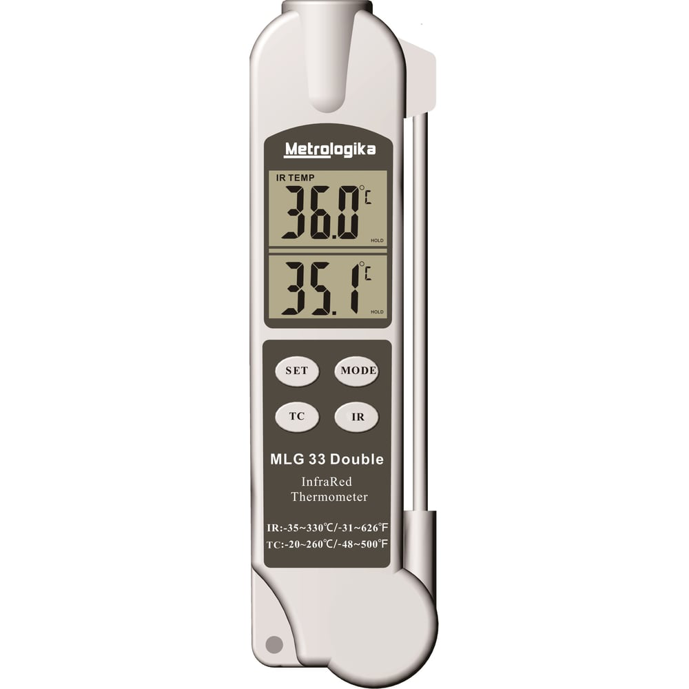 Термометр-пирометр Metrologika MLG 33 Double MLG33 – это универсальный прибор для измерения температуры двумя методами - контактно раскладным зондом и бесконтактно с помощью инфракрасного датчика (пирометра) встроенного в корпус. Имеет функцию автоматического отключения и индикацию разряда батареи. Для удобного считывания информации предусмотрен специальный двойной дисплей.