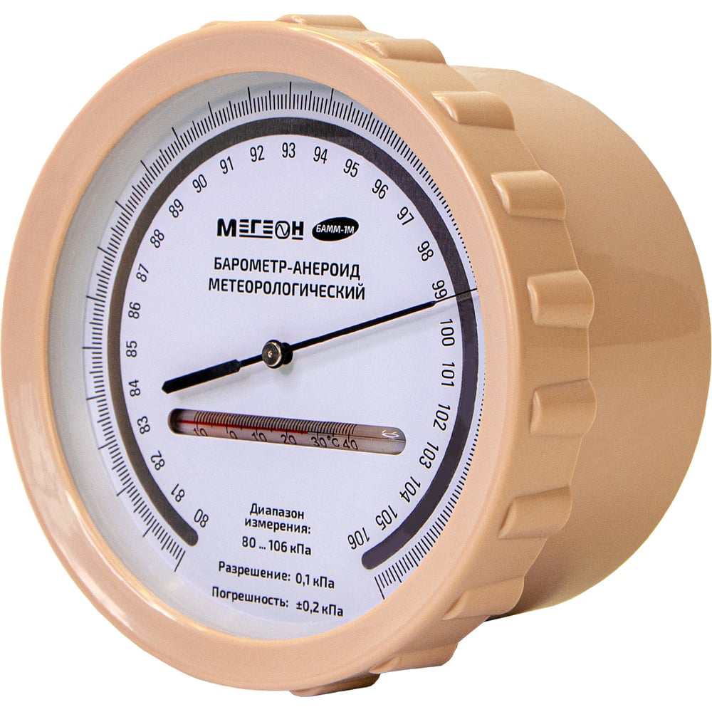 МЕГЕОН БАММ-1М – это реестровый метеорологический барометр-анероид, предназначенный для измерения атмосферного давления. Прибор внесён в ГРСИ под номером 90269-23. Может применяться в промышленных, научных и учебных целях. Модель получила классическое исполнение, компактные размеры корпуса из прозрачного и одновременно прочного пластика, а также маленький вес. Рабочие органы анероидного механизма изготовлены с применением только проверенных материалов и комплектующих в соответствии с требованием стандартов качества к подобной продукции, благодаря чему, удалось достичь низких показателей погрешности. В дополнение, на детали сделанные из сталей чёрных металлов, было нанесено антикоррозийное цинковое покрытие с последующим радужным хроматированием. Защита такого типа позволяет продлить срок службы, а также сохранить красивый внешний вид на долгое время. Не требует настроек и готов к эксплуатации. Прибор по достоинству оценят профессионалы и любители.