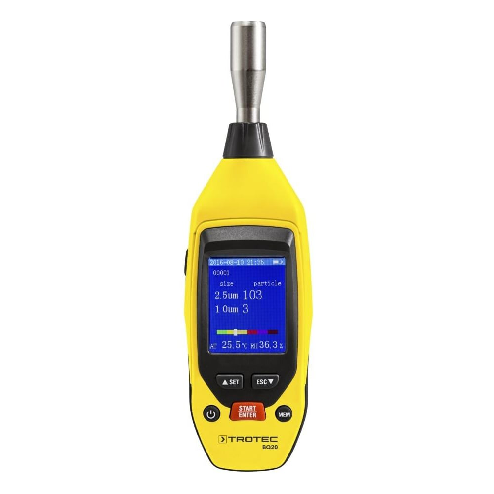 Счётчик пылевых частиц TROTEC BQ20 3510205094 - компактное устройство для измерения климатических параметров: температуру, влажность, концентрацию пыли в воздухе. Модель также определяет количественные концентрации переносимой в воздухе E-пыли (PM10) и A-пыли (PM2,5), массы частиц которых отображаются непосредственно на дисплее в виде массовой доли воздуха в микрограммах на кубический метр. Превышающие нормы показатели сообщаются звуковым сигналом.