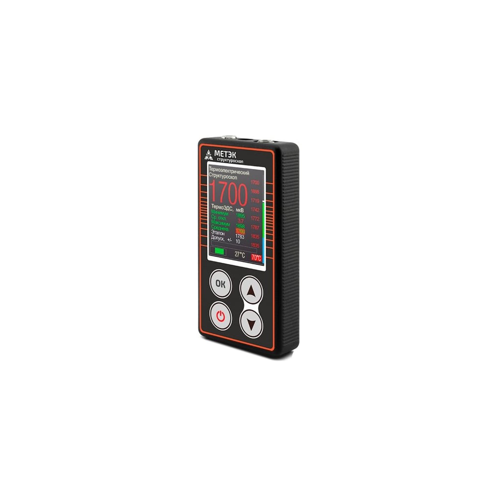 Прибор предназначен для измерения величины термоЭДС (постоянного напряжения), при неразрушающем контроле поверхностного слоя изделий из электропроводящих материалов. Прибор также может использоваться для сортировки металлов или сплавов по маркам. Особенности структуроскопа МЕТЭК: Автоматическое определение каждого нового измерения; Информативный LCD-дисплей (отображение текущего, среднего и последних 8 измерений); Контроль температуры горячего электрода и образца; Автоматическая цифровая обработка полученных результатов; Анализ однородности результатов; Сигнализация отклонения от эталонного образца; Снижена тепловая нагрузка на руки оператора; Горячий электрод из износостойкого и коррозионностойкого материала; Экспресс-контроль деталей любых размеров без извлечения из изделия. Напряжение питания от сети переменного тока220 В,50 Гц Потребляемая мощность, не более7,5 Вт Готовность к работе, не более2 мин Время анализа одного образца, не более6 сек Локальность контролируемого участка0,5 мм Температура горячего электрода, не менее40 град Температура горячего электрода, не более90 град Время непрерывной работы от аккумулятора, не менее2 ч Габаритные размеры130 х 66 х 24мм Масса без блока питания0,25 кг