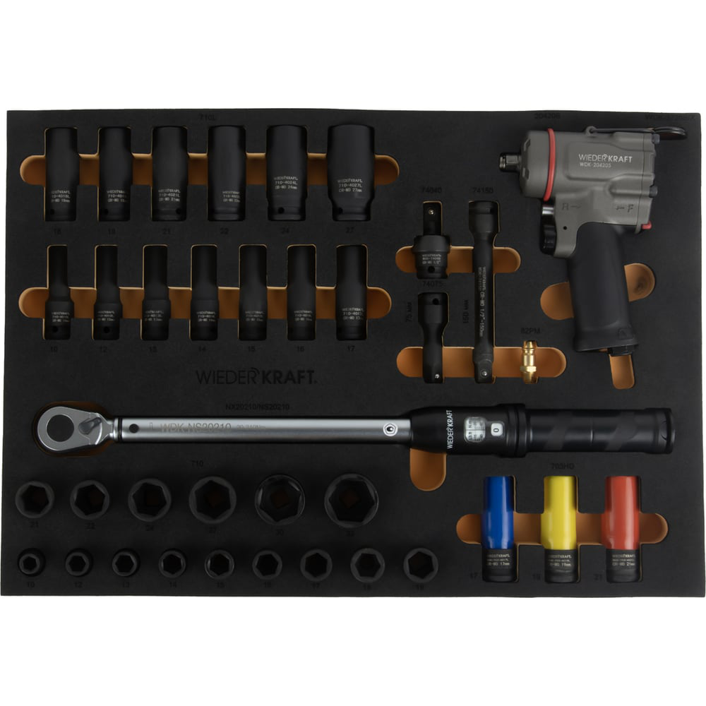 Набор пневматического и динамометрического инструмента в ложементе WIEDERKRAFT 38 предметов WDK-3720S предназначен для работы с крепежом шестигранного профиля. Укомплектован компактным пневматическим гайковертом WDK-20420S. Подходит для использования в труднодоступных местах.Динамометрический ключ WDK-NS20210 применяется для затяжки резьбовых соединений с требуемым значением крутящего момента, для работы в направлении по и против часовой стрелки (CW/CCW). Широкий диапазон измерений 20-210 Нм значительно увеличивает область применения. Особенностями ключа являются: максимальная погрешность измерений 4% от установленного значения на шкале, фиксатор значения крутящего момента нажимного типа, опто-механическая шкала с многослойной защитой от попадания пыли, высокая точность и большой рабочий ресурс (до 50 000 операций).Торцевые головки 10-32 мм изготовлены из высокопрочной стали 42CrMo. Представлены в наборе в двух вариантах – обычном и глубоком. Отличаются большой износостойкостью.Набор тонкостенных ударных головок для работы с литыми дисками автомобилей индустриального стандарта обладает увеличенным рабочим ресурсом. Размеры - 17, 19, 21 мм.Ложемент (570х395х35 мм) унифицирован для большинства инструментальных тележек. Изготовлен из высококачественного материала EVA.