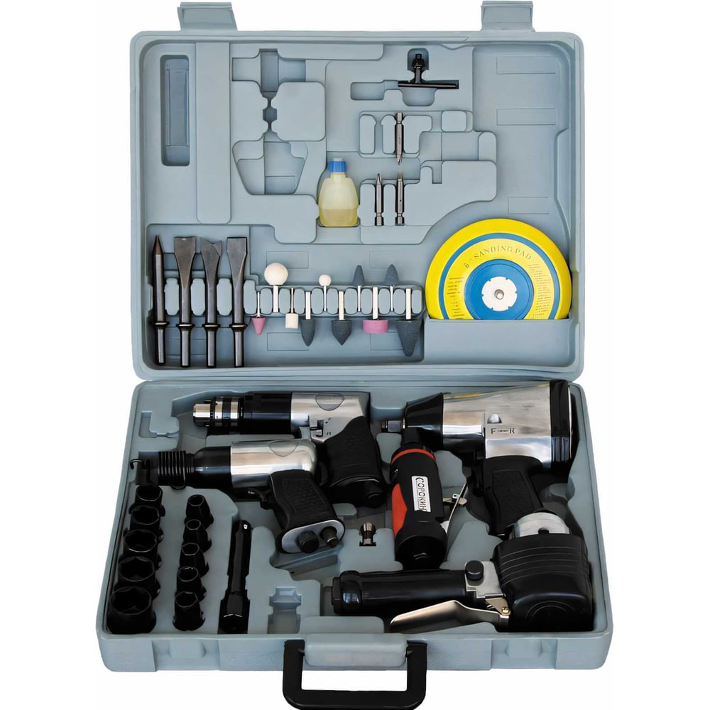 Набор пневмоинструмента Сорокин 2.154 - комплект из пяти инструментов с сопутствующими насадками. Применяется в массовом производстве, автосервисах и шиномонтажных мастерских. Включает в себя следующие инструменты: гайковерт, пневмомолоток, дрель, прямая шлифмашинка, виброшлифовальная машинка. Все инструменты работают от компрессора на сжатом воздухе давлением 6.5 атмосфер.