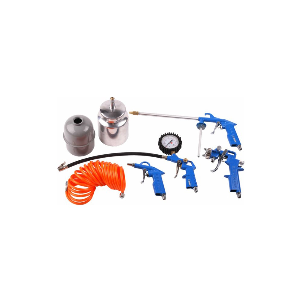 Универсальный пневматический набор "ЭКСПЕРТ" Зубр 06458-H5 предназначен для нанесения лакокрасочных и антикоррозийных покрытий. Корпуса пистолетов изготовлены из прочного алюминиевого сплава. Сопло, форсунка и игла выполнены из латуни, а пневмошланг из нейлона. Форма распыляемой струи плавно регулируется поворотом сопла и форсунки. Инструмент подключается к пневмосети или компрессору при помощи резьбового соединения 1/4 дюйма.