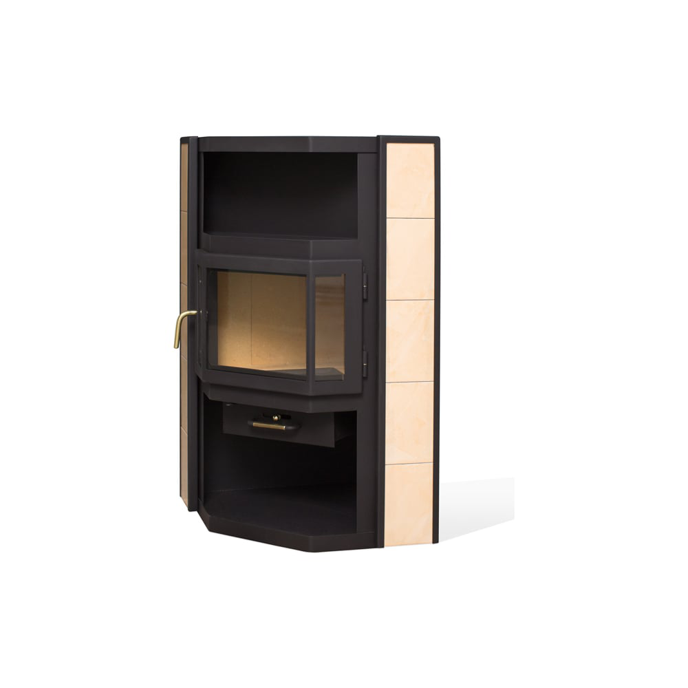 Дополнительные характеристики: Компактная угловая печь. Идеально подходит для обогрева небольшого помещения площадью 30-60 м2. Призматическая дверка высотой 310 мм. В отделке боковых поверхностей используется керамическая плитка. Размер поленьев 25 -27 см. Подсоединение к дымоходу сверху.