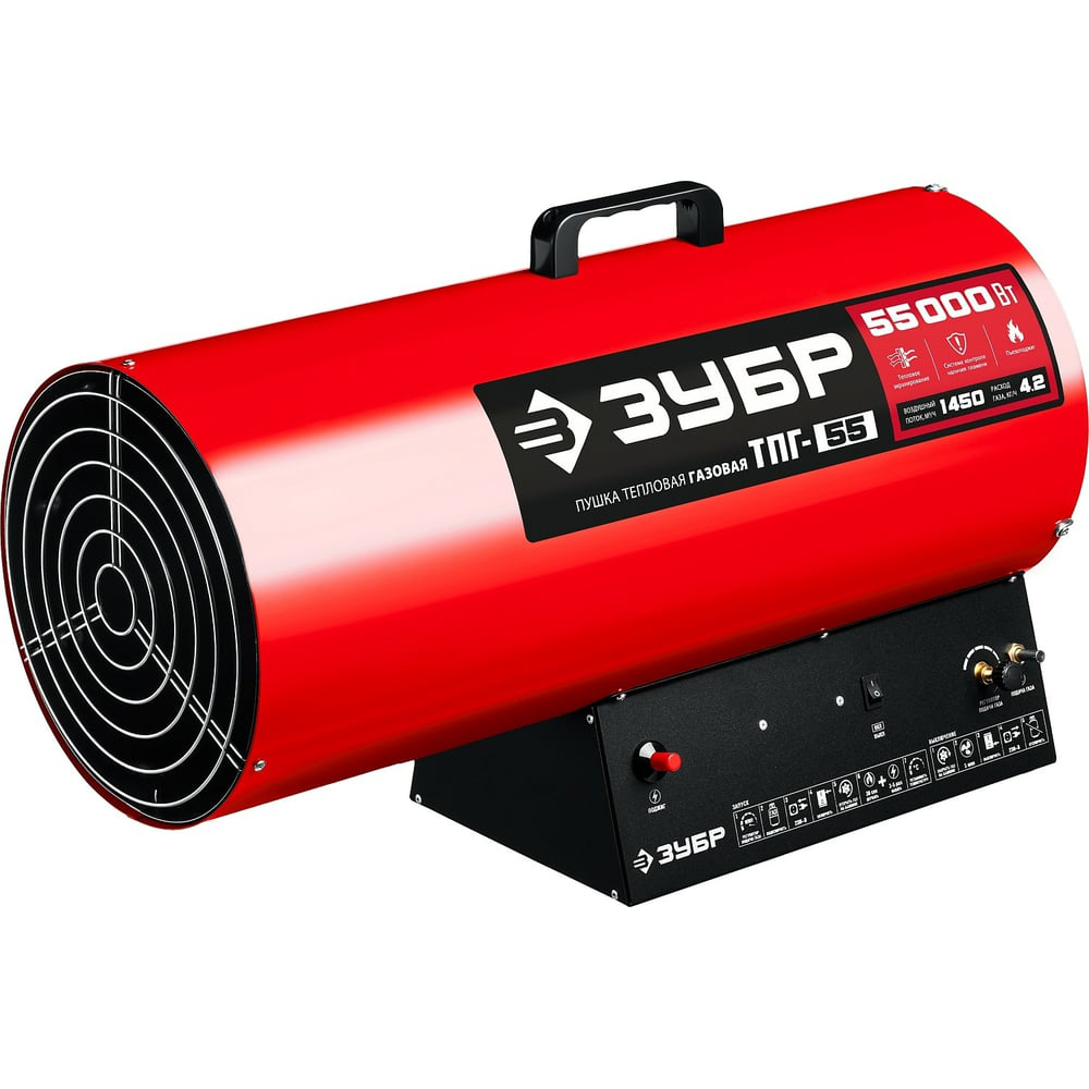 Газовая тепловая пушка ЗУБР 55 кВт ТПГ-55 - высокоэффективный газовый обогреватель, работающий на наиболее распространенном виде топлива. Оптимально подходит для использования на открытых и полузакрытых площадках для просушки и обогрева, размораживания траншей и аварийного прогрева помещений, а так же для монтажа натяжных потолков. Надежный поджиг дуги и эффективное горение гарантируют безотказную подачу тепла в любых условиях эксплуатации. Применяется для генерации горячего воздуха, который может быть использован для обогрева, сушки промышленных, складских, вспомогательных помещений и т. д.