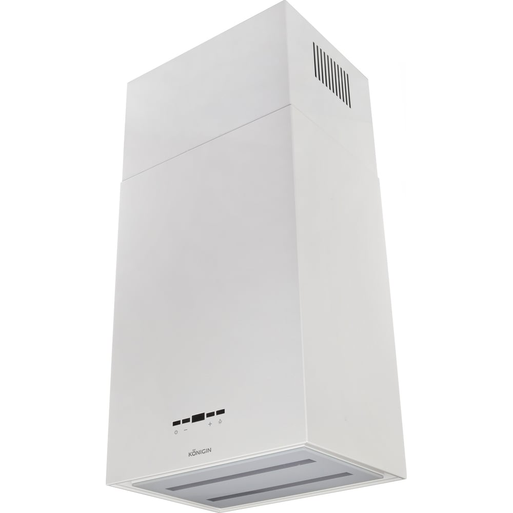 Кухонная вытяжка KONIGIN Geometry White/White Glass 102070 - дизайнерское островное устройство в форме прямоугольного параллелепипеда становится центральным вертикальным элементом, связывающим дизайн кухни воедино. Стильное сочетание нержавеющей стали "сатин" и блеска закаленного стекла создают ощущение легкости прочной конструкции. Декоративный стеклянный люк скрывает алюминиевый, жироулавливающий фильтр, придавая завершенность композиции. Новейший конденсаторный мотор, очень мощный и тихий, произведен в Польше.