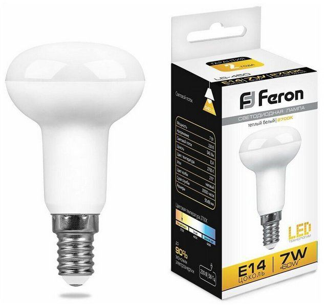 Лампа светодиодная Feron R50 LB-450 7W 2700K E14, 25513 - это энергоэффективная светодиодная лампа, предназначенная для использования в бытовых и коммерческих помещениях. Светильник имеет цоколь E14 и мощность 7 ватт, что обеспечивает яркое освещение при минимальном потреблении электроэнергии. Теплый белый свет с температурой 2700K создает уютную и комфортную атмосферу в помещении. Лампа Feron R50 LB-450 7W 2700K E14 отличается долгим сроком службы и надежностью, что делает ее отличным выбором для освещения различных помещений.