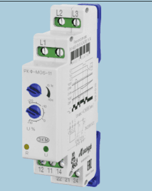 НАЗНАЧЕНИЕ РЕЛЕРеле контроля фаз РКФ-М06-11-15 предназначено для контроля трёхфазного линейного напряжения в трёхпроводных сетях (без нейтрали). Реле контролирует порядок чередования фаз, обрыв и «слипание» фаз, асимметрию напряжения, превышение напряжения выше фиксированного значения, снижение напряжения ниже установленного порога. Технические характеристики реле приведены в таблице.