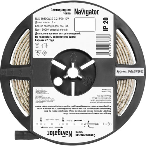 Светодиодная лента Navigator IP20 12V 7.2Вт/м 6000К NLS-5050СW30- R5 СД (5м), 71766 - это высококачественная гибкая светодиодная лента, предназначенная для освещения различных помещений. Ее яркий холодный свет с температурой 6000K создаст яркое и равномерное освещение в любом интерьере. Лента имеет защиту IP20, что обеспечивает ее безопасное использование внутри помещений.Светодиодная лента Navigator легко монтируется благодаря своей гибкости и самоклеящейся основе. С низким энергопотреблением 7.2Вт/м и напряжением 12V, она экономична в использовании. Длина ленты составляет 5 метров, что позволяет осветить большую площадь.