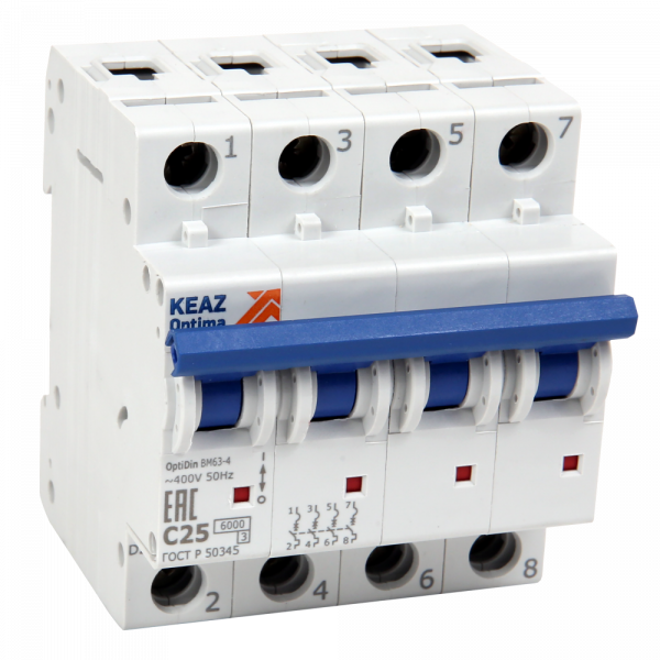Модульный автоматический 4 полюсный выключатель переменного тока с предельной коммутационной способностью при переменном токе 6 кА на номинальный ток 10 А .