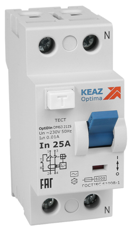 2 полюсное устройство защитного отключения на номинальный ток 40 А, номинальный отключающий дифференциальный ток 30 мА и рабочее напряжение переменного тока 230 В.