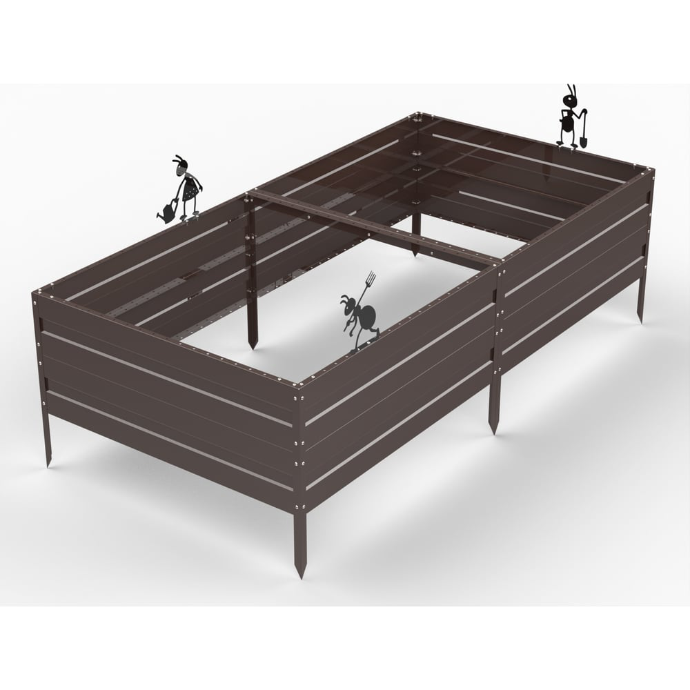 Грядка Metalex серия KitGarden 2x1 х 0.4 м. Коричневая. Изготовлена из металла толщиной 0,8 мм, что является самой большой толщиной на Российском рынке. После установки грядки не требуют дополнительного ухода. По периметру грядки есть перфорация: размер 7 мм, шаг 50 мм, который позволяет устанавливать декоративные элементы и аксессуары. Усилительные уголки надежно соединяют боковины грядки друг с другом и задают правильную геометрическую форму. В комплект входит набор колышков, который надёжно удерживает грядку в земле. Порошковое покрытие защищает металл от коррозийных процессов и обеспечивает продолжительный срок службы. В набор входит комплект декоративных элементов «Веселые муравьи», они добавляют индивидуальный облик вашему дачному участку. По желанию его можно не устанавливать. Соединение: Болтовое